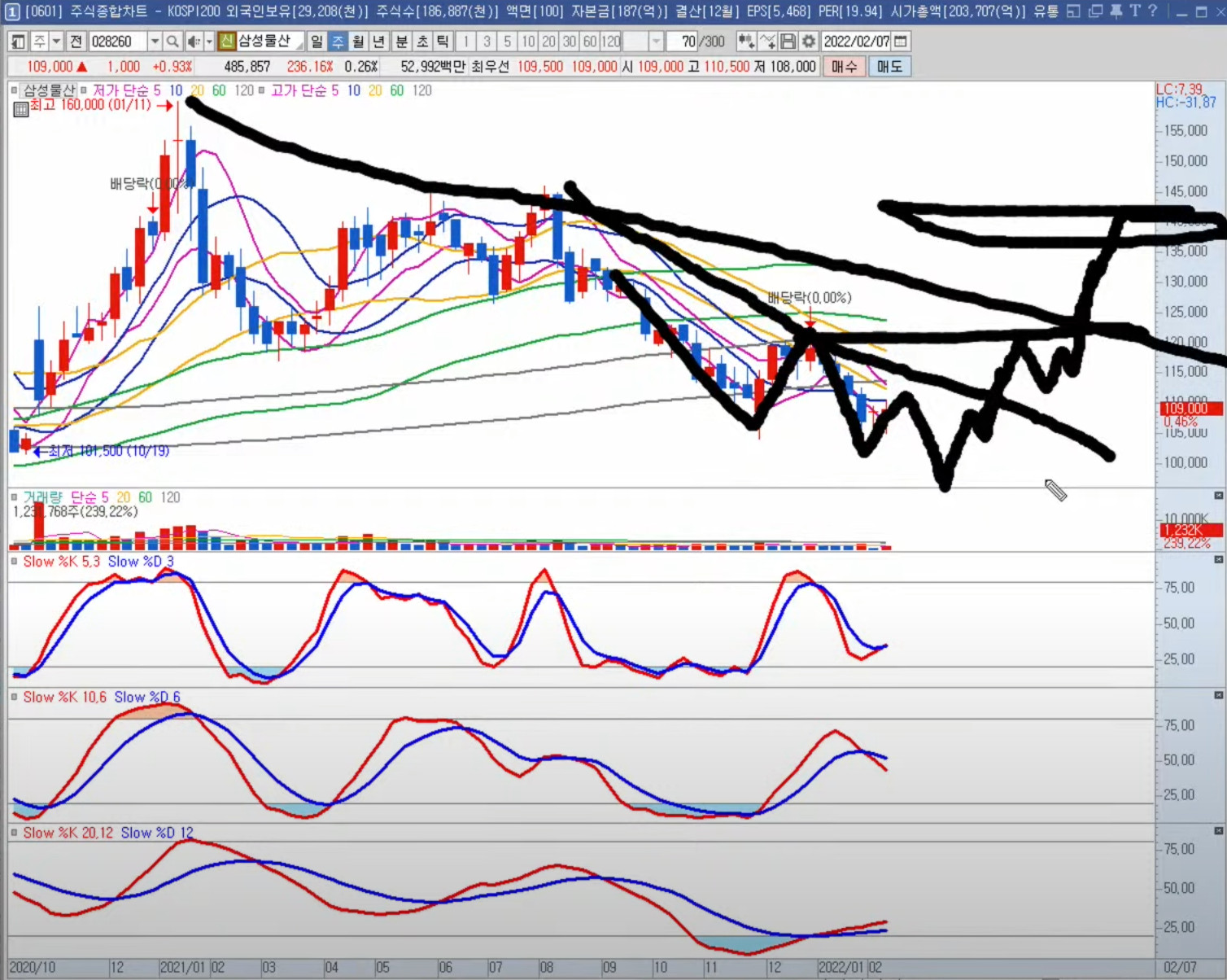 삼성물산 차트를 보여주고 향후 진행 방향에 대해 반디캠을 이용해서 추세에 대한 그림을 그렸는데